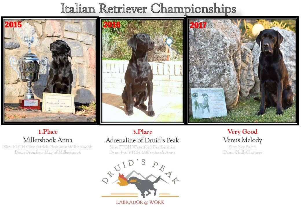 Aus diesem Wurf blieb Cathy (Adrenaline of Druid’s Peak), die einzige Hündin des Wurfes, bei mir und ich brachte sie im Jahr 2018 zum Internationalen Field Trial Champion. Ausserdem qualifizierte sie sich bis jetzt 4 mal für das Italienische Championship. Im Jahr nach dem Sieg ihrer Mutter platzierte sich Cathy auf dem dritten Platz! Zwei Jahre später hatte sie einen guten ersten Tag aber einen Patzer im ersten Retrieve und wurde leider nicht mehr am nächsten Tag aufgerufen.
